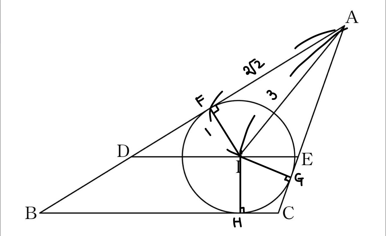 문제에서 선분 AI의 길이가 3이고 내접원의 반지름은 1이기 때문에 피타고라스 정리에 의해