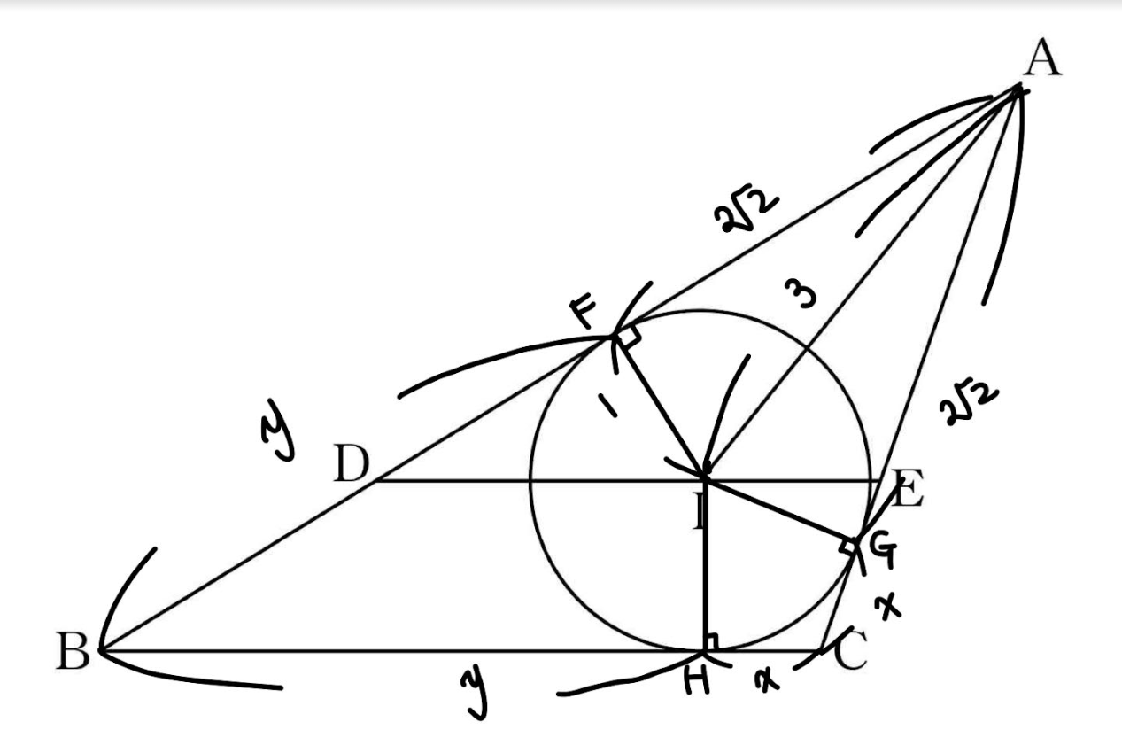 결국 삼각형 ADE의 둘레 = AB + AC = \(2\sqrt{2} \times 2 + x + y = 7\sqrt{2}\)